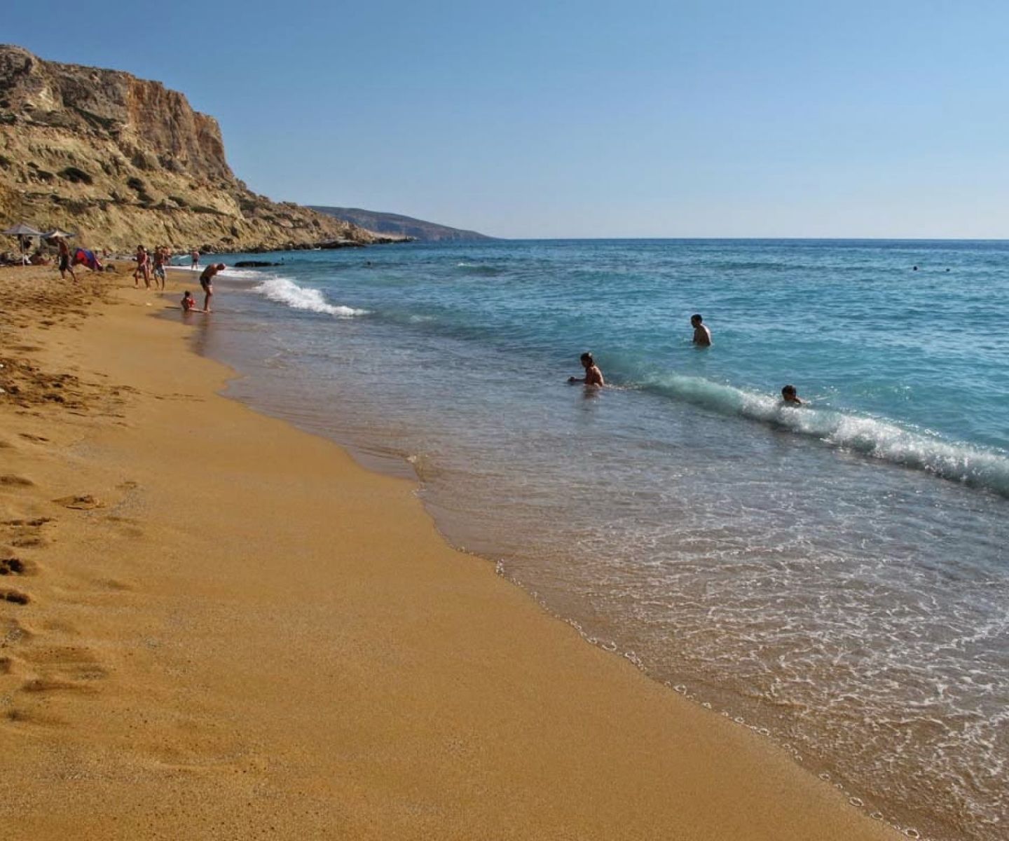 It is open to the strong south winds, and not very organized – just a few umbrellas and sunbeds, as well as a small café-canteen, built roughly out of stone. It is sensible, if you visit, to take all you need with you as the canteen is not always open, and there are no tavernas or shops nearby.